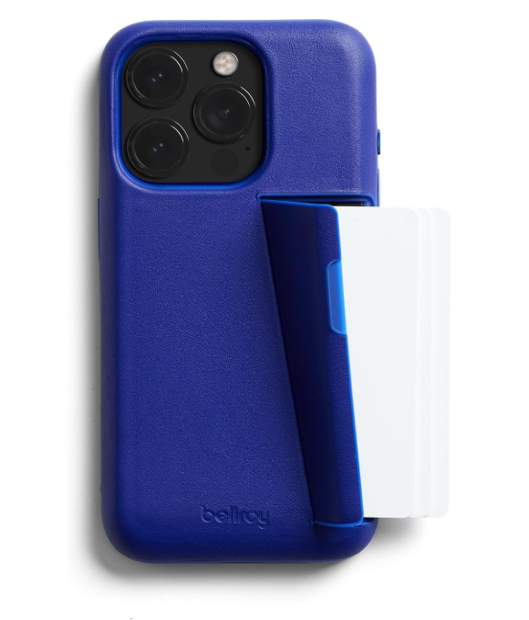 Bellroy Phone Case – 3 Card for iPhone 15 Pro (leather iPhone case, phone wallet) – Cobalt (Retrofit) – with Button Add-on