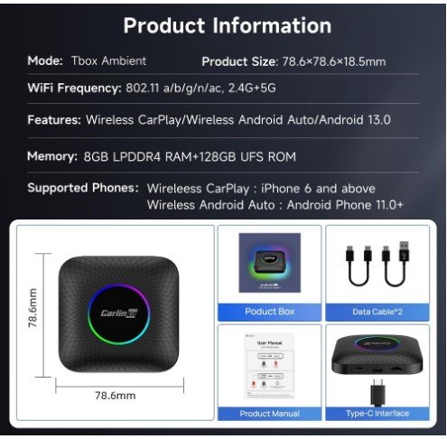 CarlinKit New Android 13 AI Box LED Ambient: Wireless CarPlay/Android Car Adapter