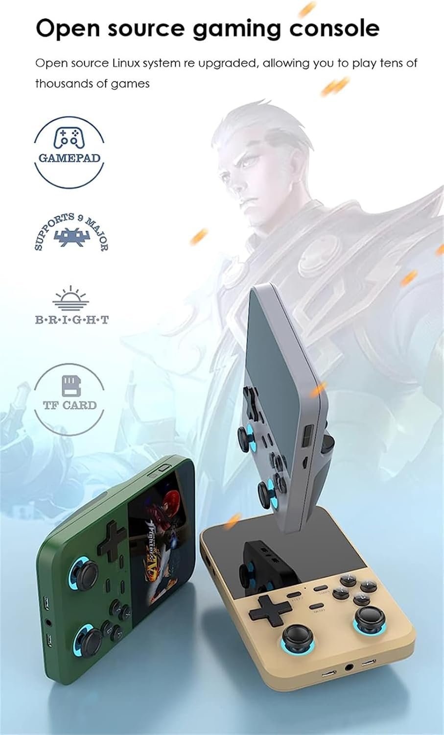 - Games: Handheld game console support connecting handle two-player games, built-in more than 10,000 games, RK3326 quad-core 1.5GHZ, the game can run smoothly without lag, increasing the excitement of the game.