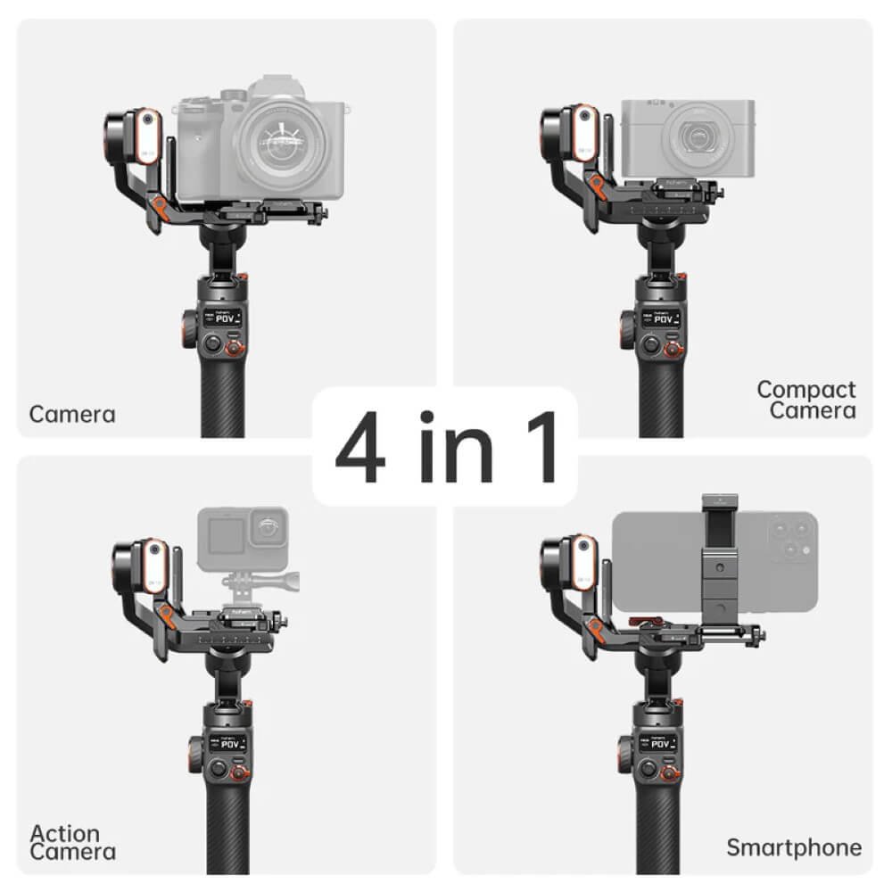 One of the standout features of the Hohem iSteady MT2 is its impressive 4-in-1 compatibility. It can support a payload of up to 1.2kg, making it suitable for various devices, including smartphones, action cameras, compact cameras, and DSLRs. It is also compatible with popular mirrorless cameras like the Sony ZV-E10, Sony A7S III, Canon EOS R5, and Nikon Z7II, among others. For a comprehensive list of compatible cameras, refer to the overview.