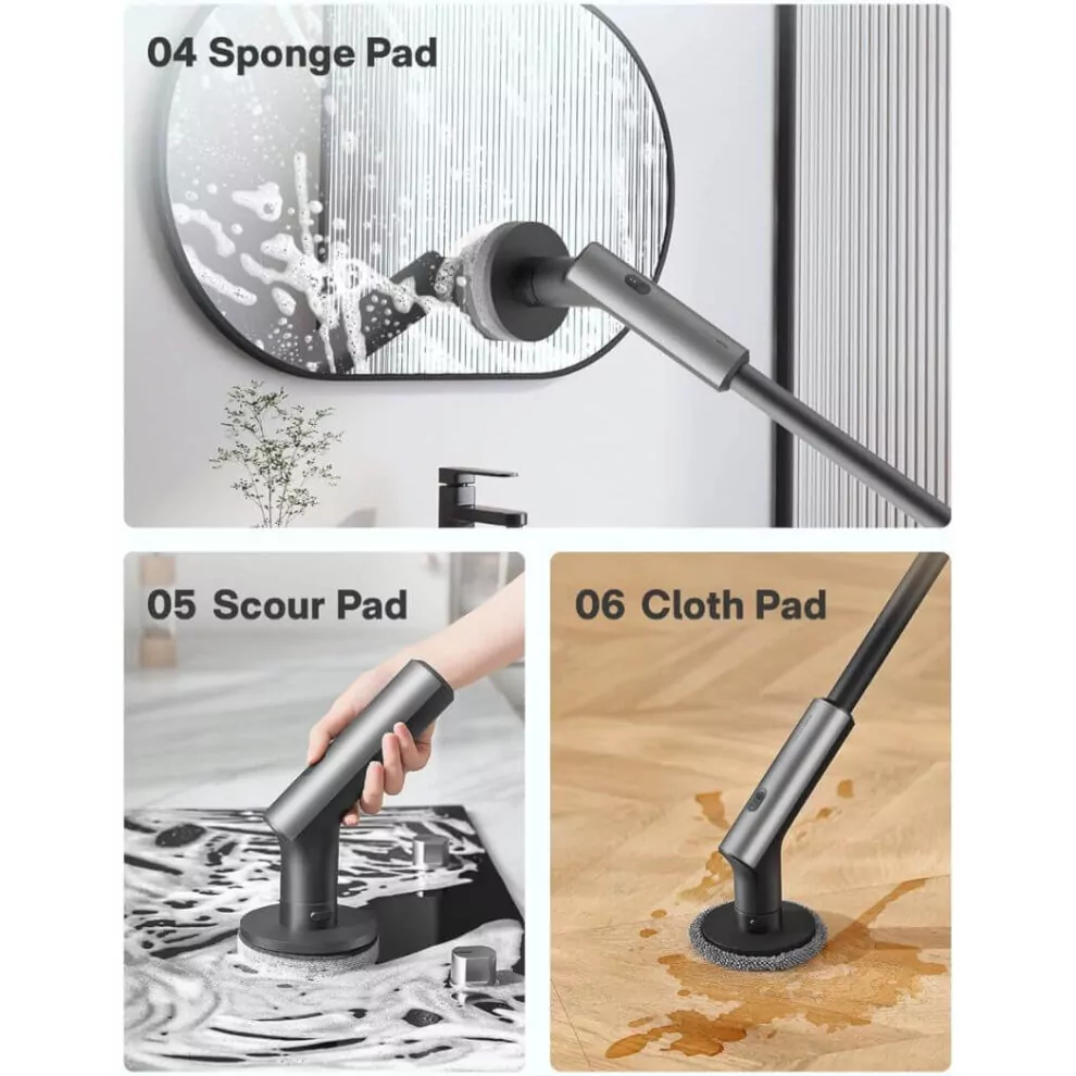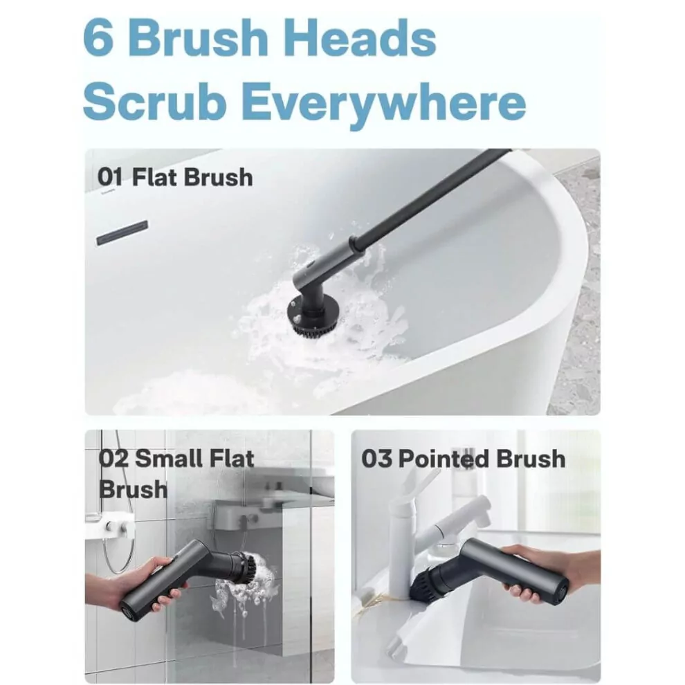 The HOTO shower scrubber brush comes with 6 durable and high-quality brush heads. It effortlessly handles tasks such as removing water deposits, calcium buildup, and tile grout grime, making your cleaning tasks a breeze.