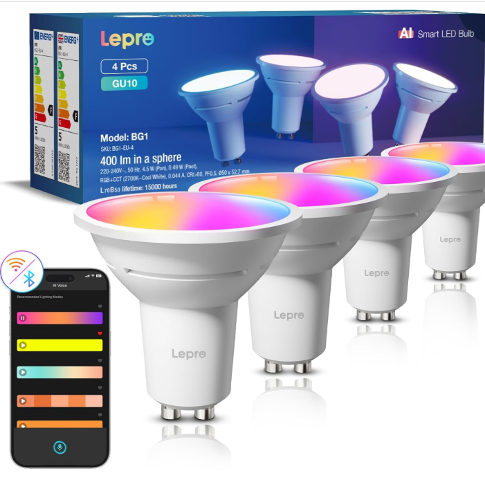 Lepro BG1 AI Smart Bulbs GU10, 400lm 4.5W Spotlight Bulb Dimmable, RGB 2700K-5700K, 50W Halogen Equivalent, Personalized AI Lighting Designer,
