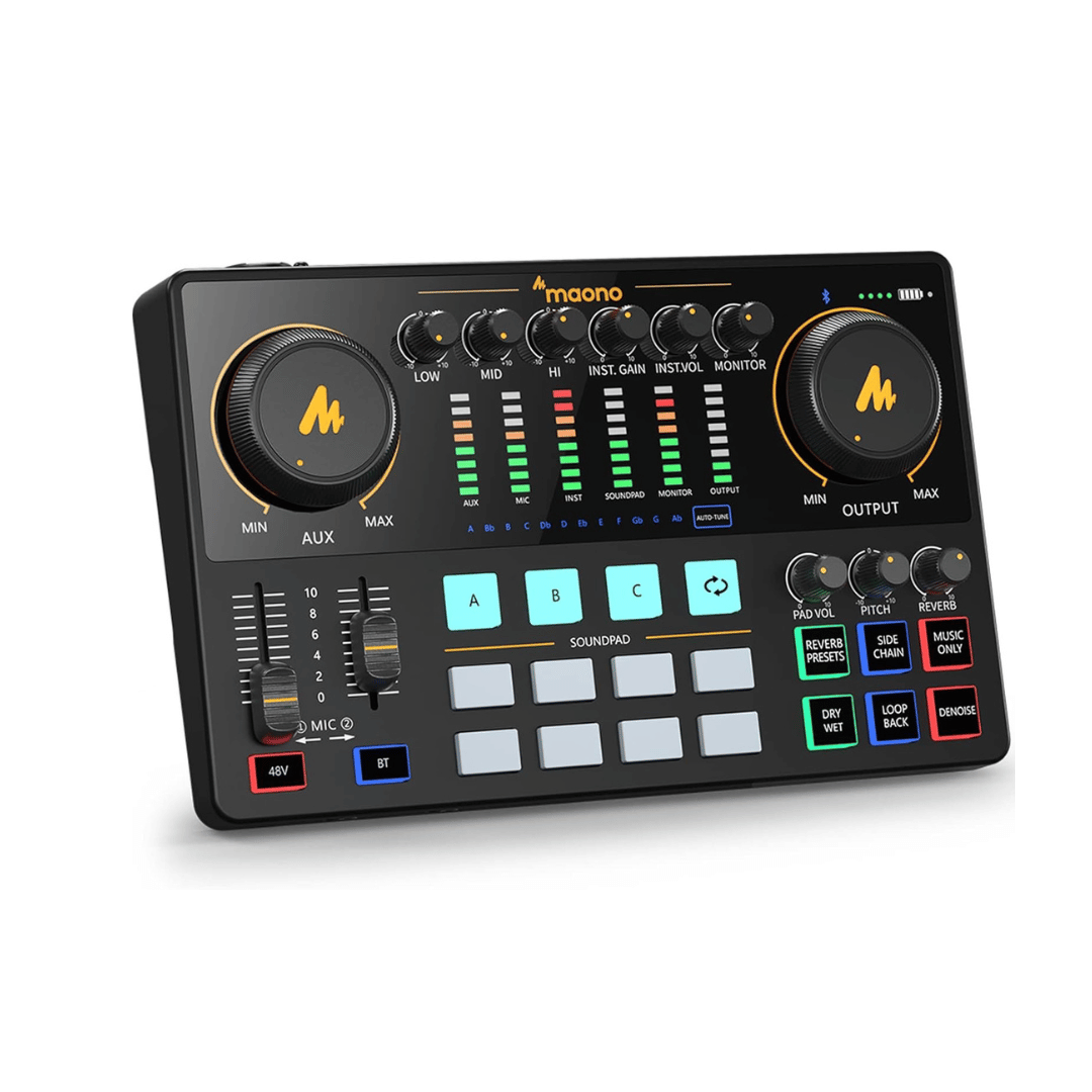 MAONO Audio Interface, MaonoCaster 10-Channel Podcast mixer with Pro-preamp, 48V Phantom Power, Bluetooth, 11 Customize sound pads for Recording, Streaming, Youtube, TikTok, PC, Guitar (AME2)