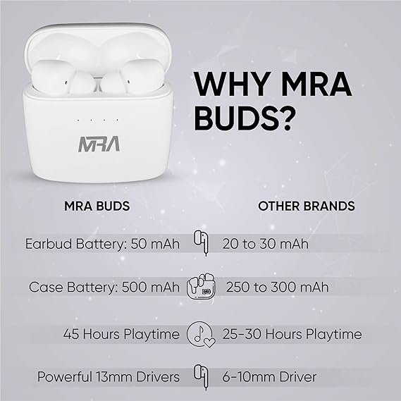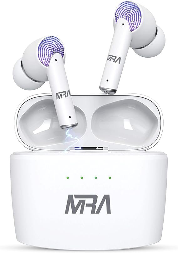 MRA Earbuds, 45 Hour Battery, 13mm Drivers for Deep Bass, Waterproof, 5.4 Bluetooth Connection, Noise-Cancelling, Tap-to-Control, Battery Status Indicator, Premium Earphones for Music/Calls black