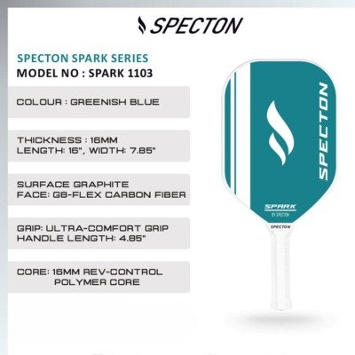 The Specton Spark 1103 Pickleball Paddle in Greenish Blue is expertly crafted to deliver a perfect blend of performance and style. Its vibrant design and superior features make it a standout on the court for players seeking both functionality and aesthetics.