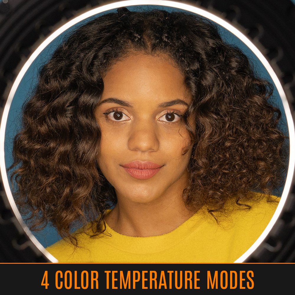 Premium Ring Light delivers studio-grade lighting for your every need, making it perfect for streaming, vlogging, photography, video recording, and more. Adjust between 4 color temperature modes and 10 brightness levels to find the perfect look for you.