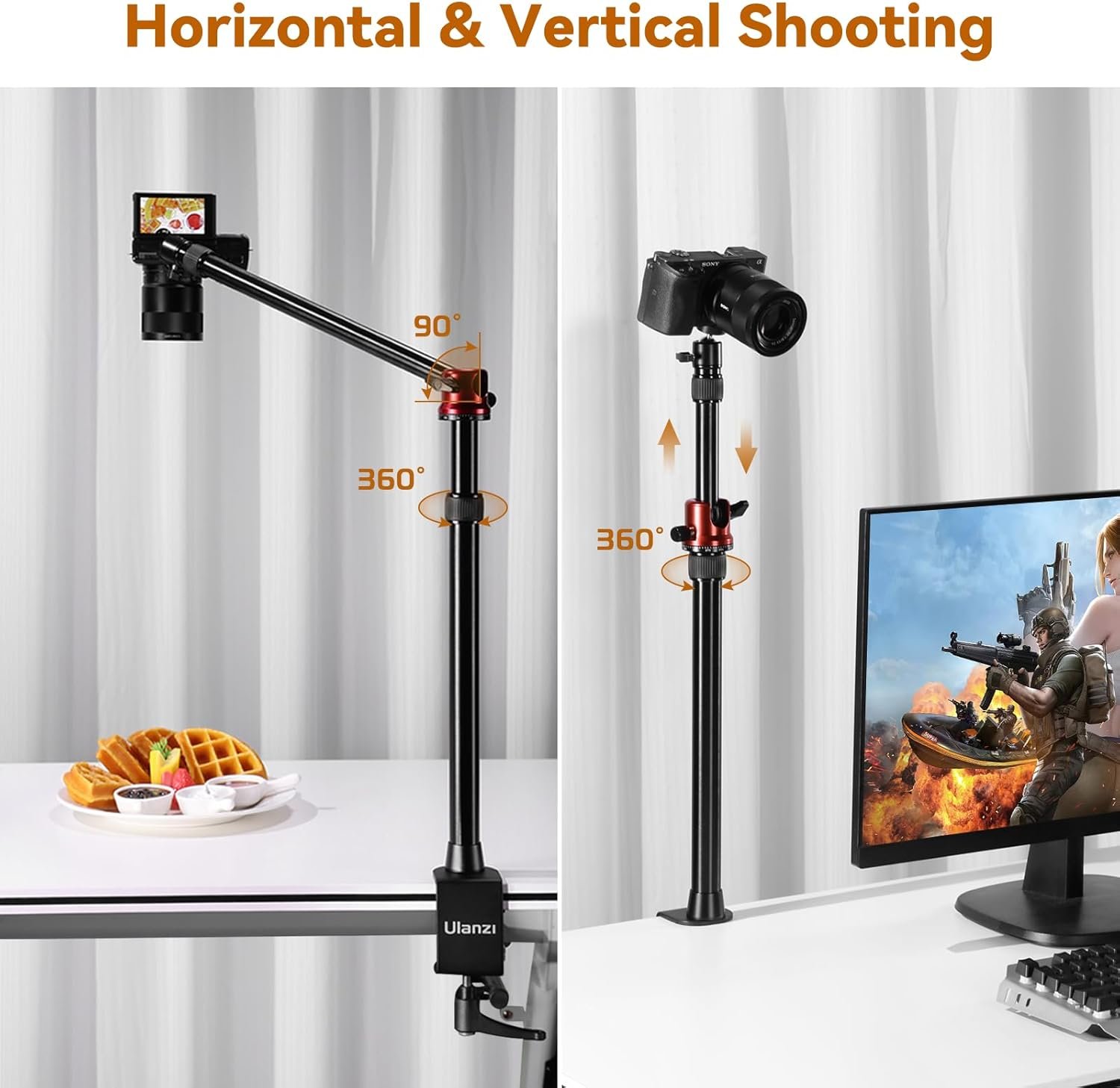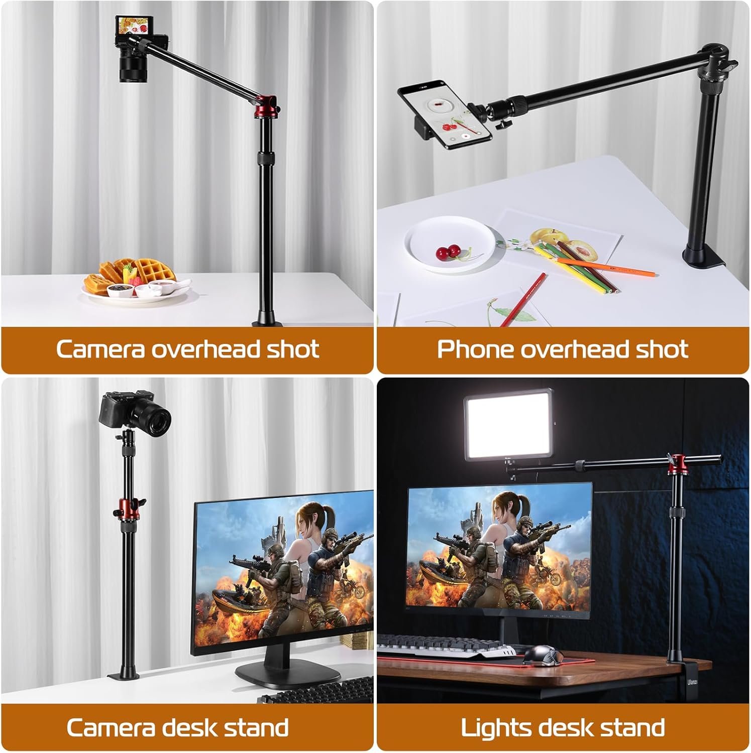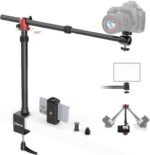• Overhead camera mount stand with two sections of crossbar, the crossbar can be adjusted length can be rotated horizontally 360 degrees, to meet your needs for more use, to enhance your experience.