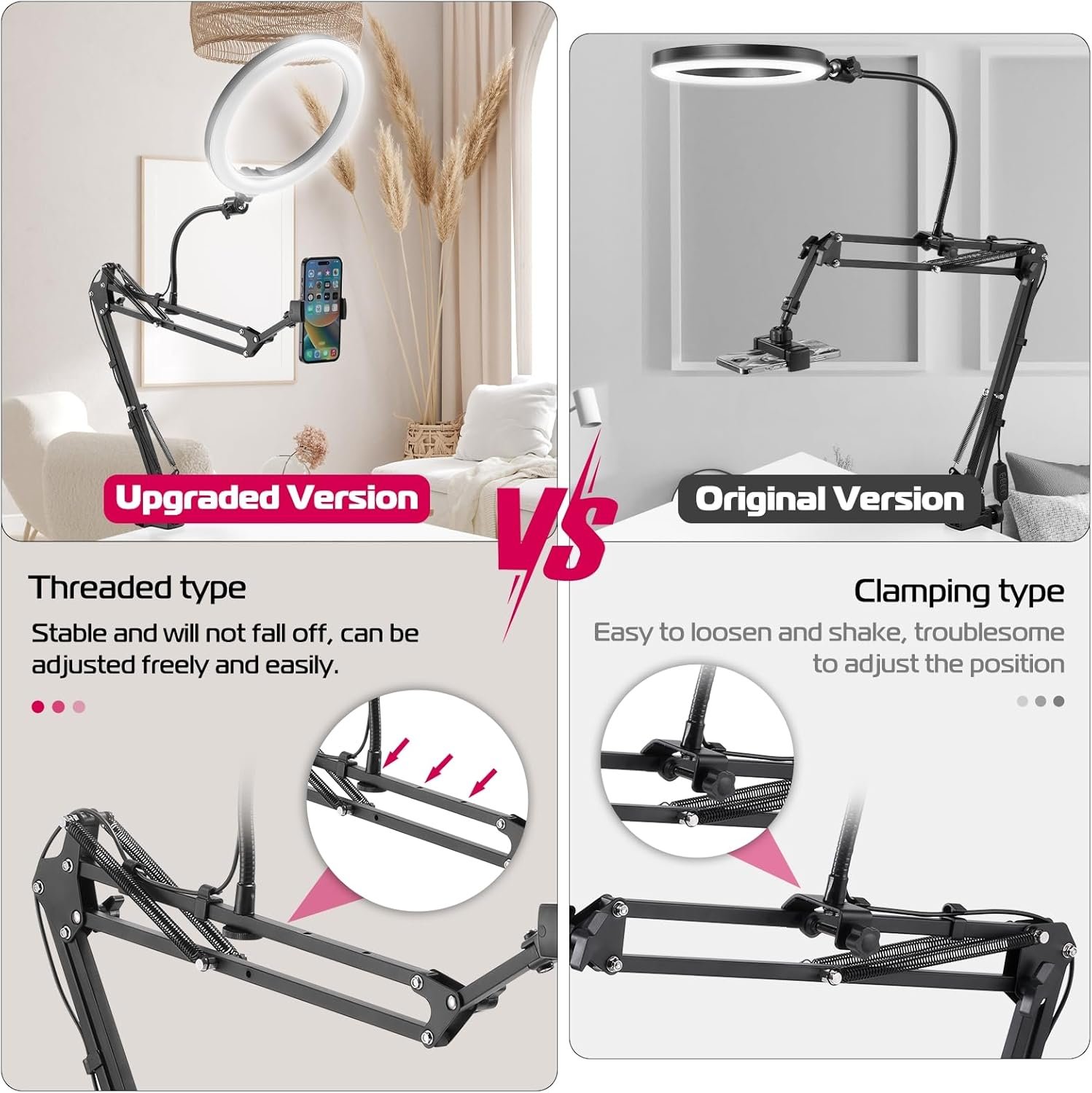 - 【Upgraded TH03 Overhead Recording Stand】 Based on the T3 overhead phone stand, we upgraded the buckle fixing setting of the ring light to an embedded screw fixing setting. This greatly improves the stability of the ring light, and you no longer need to worry about whether the light will fall during use.