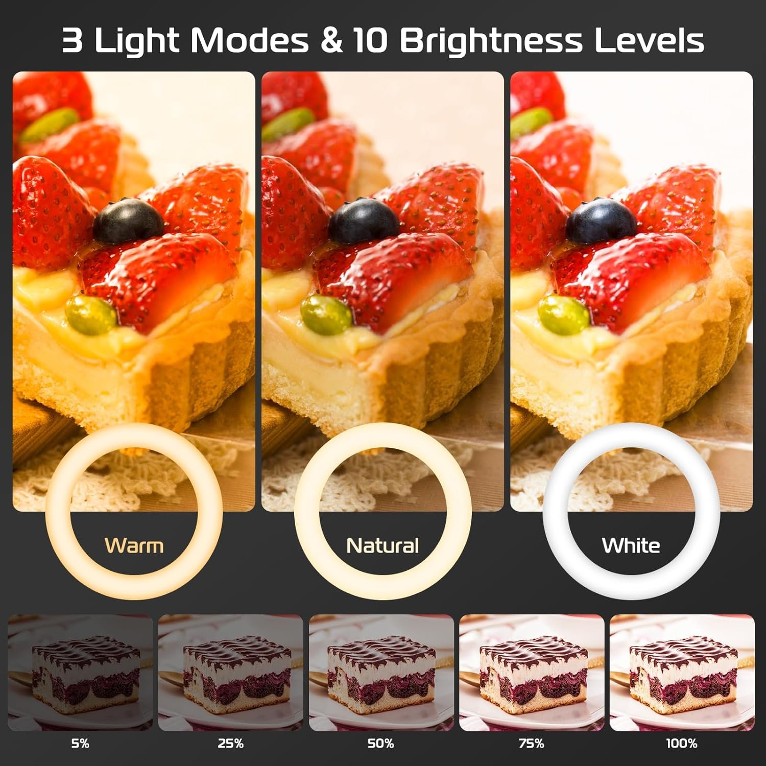 - ▶【Adjustable Brightness & Color Temperature】 This ring light uses 60 energy-saving LED beads with adjustable brightness (0-100%) and color temperature (3000k – 6000k), providing you with different lighting options and excellent shooting effects. This is a must-have item for shooting still life/live streaming/video conferencing or providing lighting when you read or write homework.